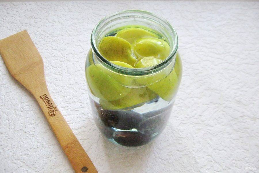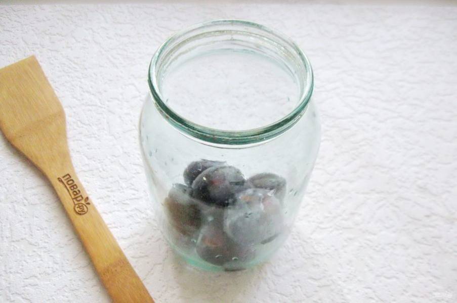 Сливы вымойте и выложите в стерилизованную банку. Консервировать целые или половинки решать вам.