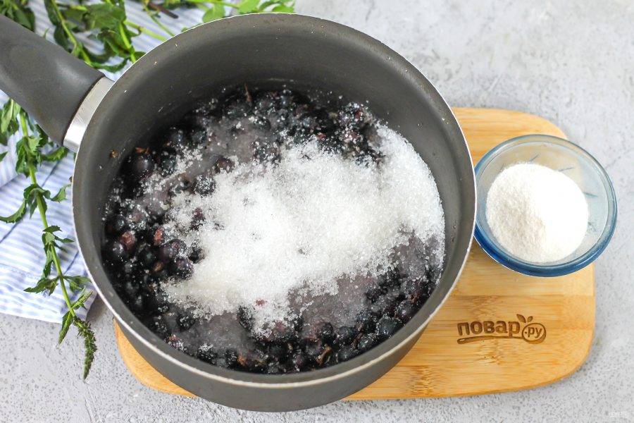 Черную смородину промойте в воде и высыпьте в казан или в ковш с антипригарным дном. Добавьте туда же сразу и сахарный песок. Помните, что смородина — кислая ягода, поэтому сахара не жалейте!