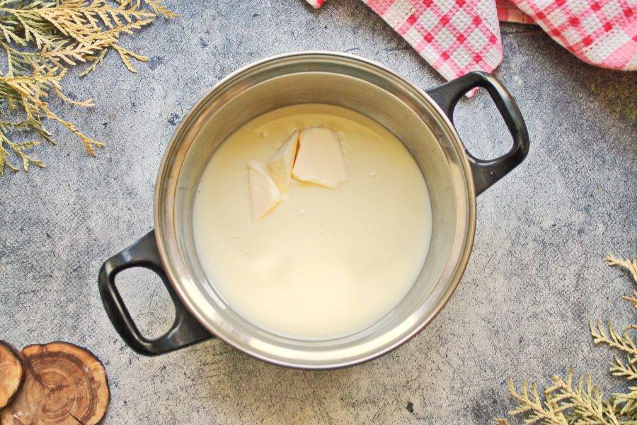 В кастрюлю с толстым дном налейте сгущенное молоко и добавьте сливочное масло.