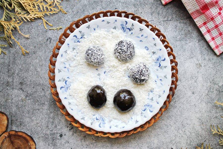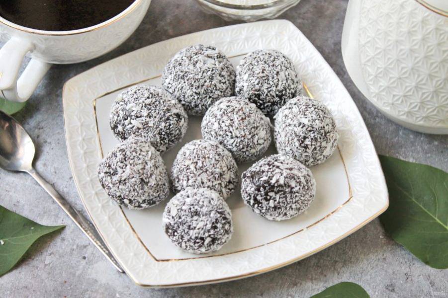 Берите массу чайной ложкой и формируйте круглые конфеты. Затем обваляйте их в кокосовой стружке и подавайте к столу.