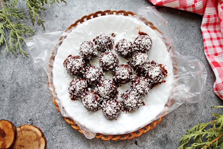 Шоколад растопите на водяной бане и окуните в него конфеты, чтобы они покрылись. Выложите на пленку и посыпьте сверху кокосовой стружкой. Оставьте до полного застывания шоколада.