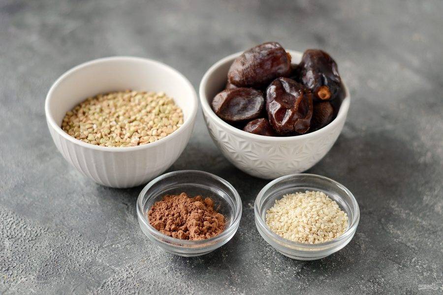 Измельчите блендером финики, зеленую гречку и какао до однородной массы.