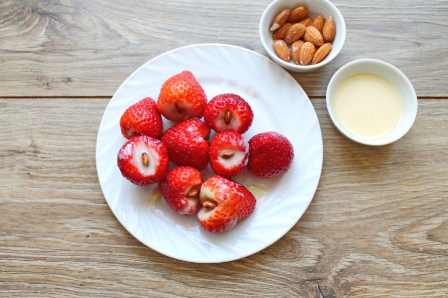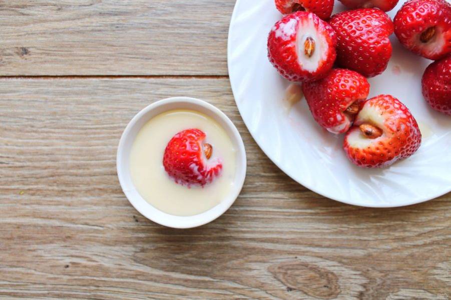 У клубники удалите хвостик и сделайте небольшой разрез. Миндаль окуните в сгущенное молоко и полностью вставьте в середину ягод со стороны плодоножки в разрез.