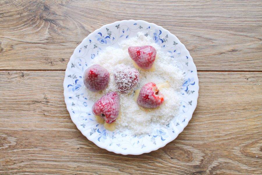 Обваляйте ягоды в кокосовой стружке, установите на блюдо, чтобы они не соприкасались. Уберите конфеты в морозильную камеру на 15 минут, чтобы стружка схватилась и хорошо держалась. После этого подавайте на стол.