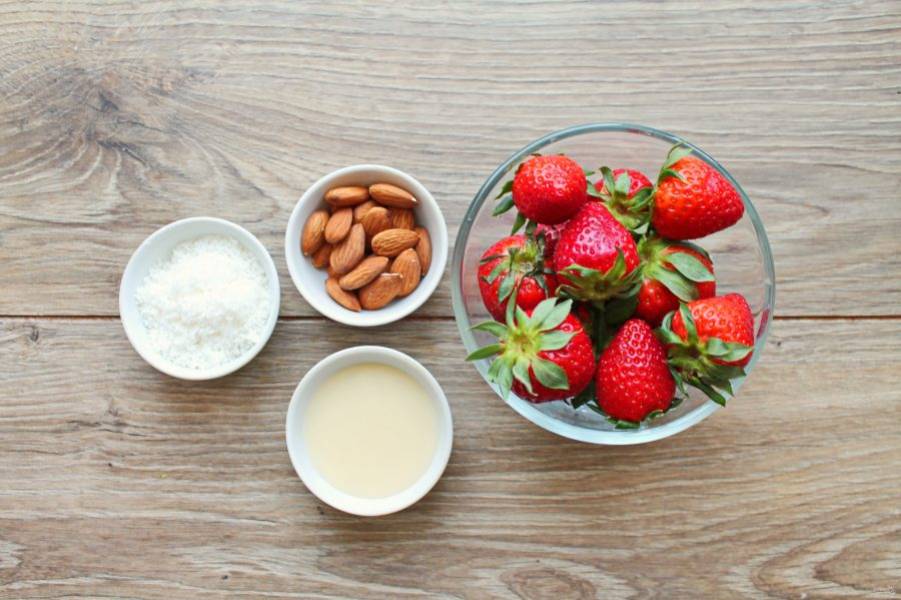 Подготовьте все необходимые ингредиенты для приготовления конфет "Клубничные поцелуйчики". Клубнику переберите, сполосните и дайте хорошо высохнуть.