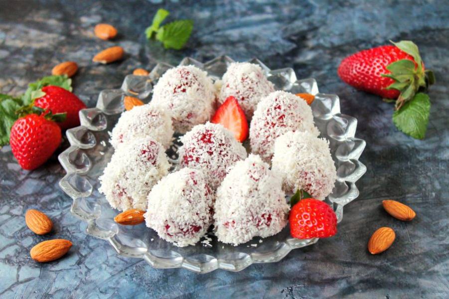 Хочется конфет, но чтобы полезно и просто? Тогда этот рецепт для вас! Ведь под пушком кокоса, спрятана сочная ягода со сливочным вкусом и орешком внутри. Берите рецепт на вооружение!