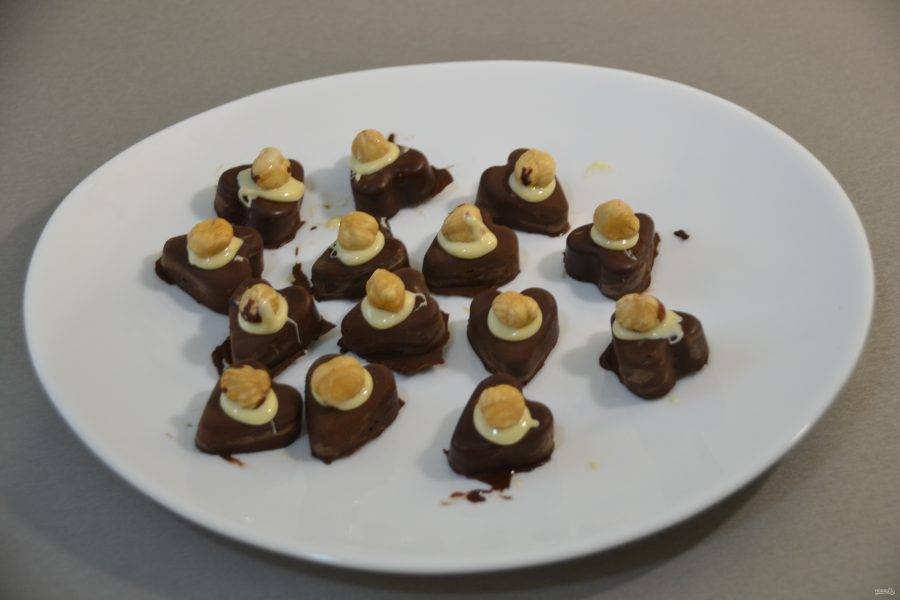 Капните сверху каплю белого шоколада, сверху уложите обжаренный фундук.