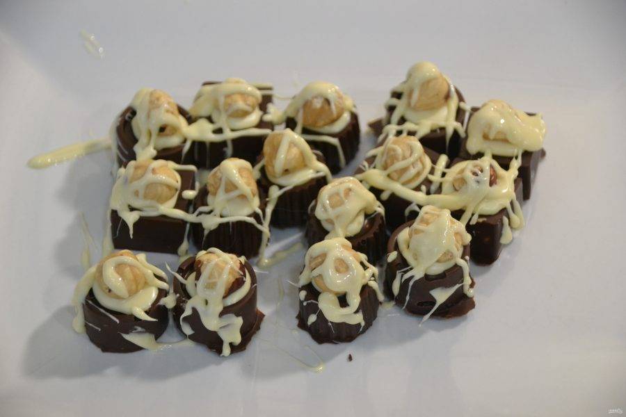 Из остатков белого шоколада можно сделать сеточку. После этого необходимо отправить конфеты снова на холод на несколько минут.