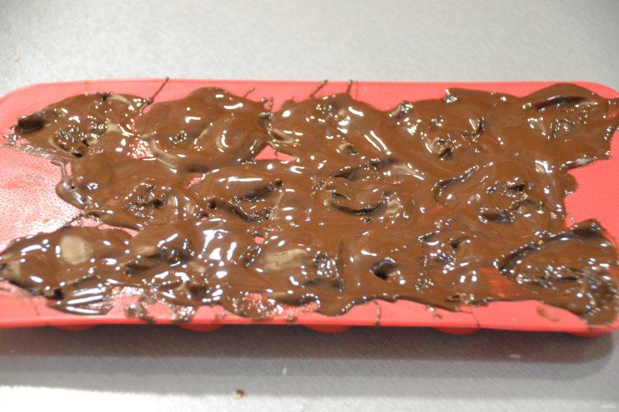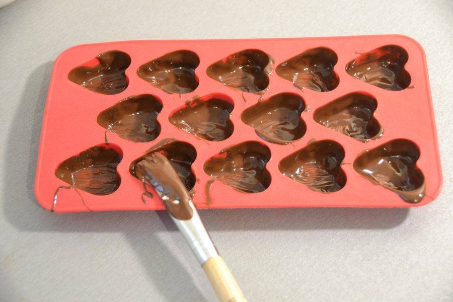 Нанесите первый слой шоколада тонкой кистью, подойтет широкая кисть для рисования и отправьте в морозилку на 3-5 минут. Повторяйте такое покрытие трижды, чтобы образовался достаточный слой глазури, то есть покрыли шоколадом, заморозили, снова покрыли шоколадом и заморозили, и еще один раз повторяем эту процедуру.