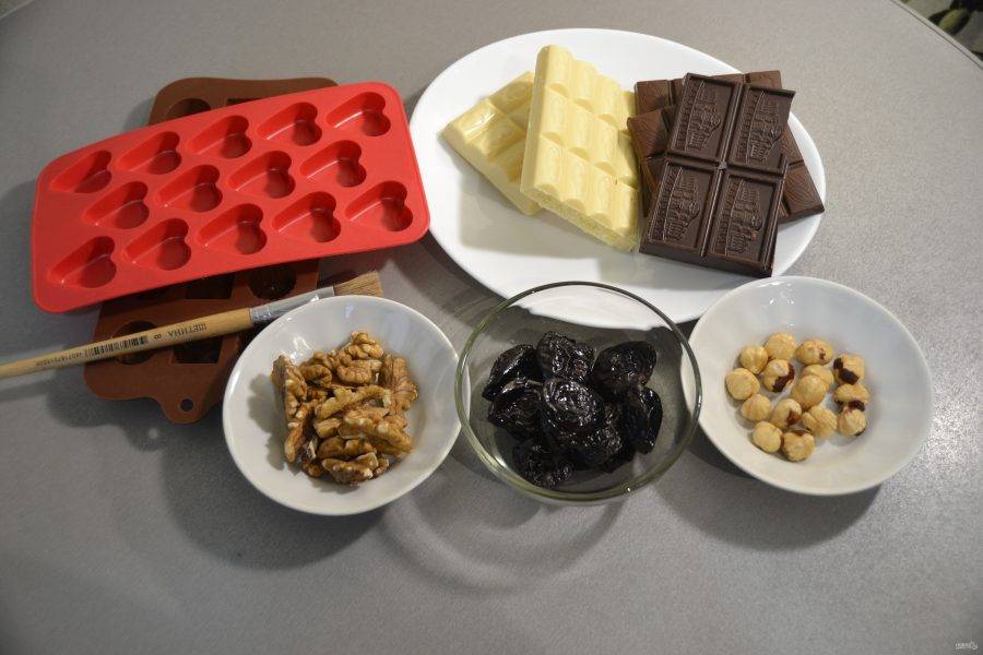 Приготовьте продукты согласно рецепту, а также силиконовые формочки для приготовления шоколадных конфет или для льда.