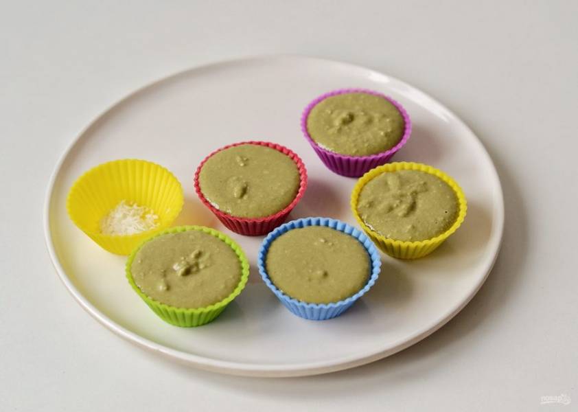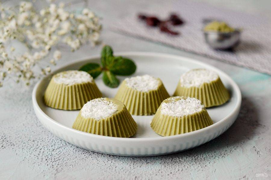 Разложите получившуюся массу по силиконовым формочкам. На дно формочек можно насыпать немного кокосовой стружки или орехов для украшения. Уберите конфеты в морозилку на 10 минут.