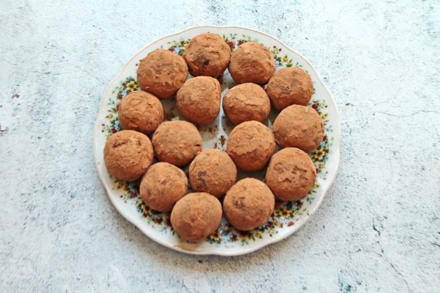 Разделите массу на части и сформируйте из этой пластичной массы кругляши, внутрь "вставьте" орешек. Обваляйте каждую конфетку в какао, выложите в один слой и уберите в холодильник на 1-2 часа.