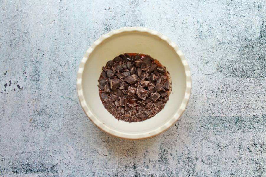 Шоколад смешайте с конфитюром и растопите на водяной бане до однородности. Влейте коньяк, перемешайте и остудите.