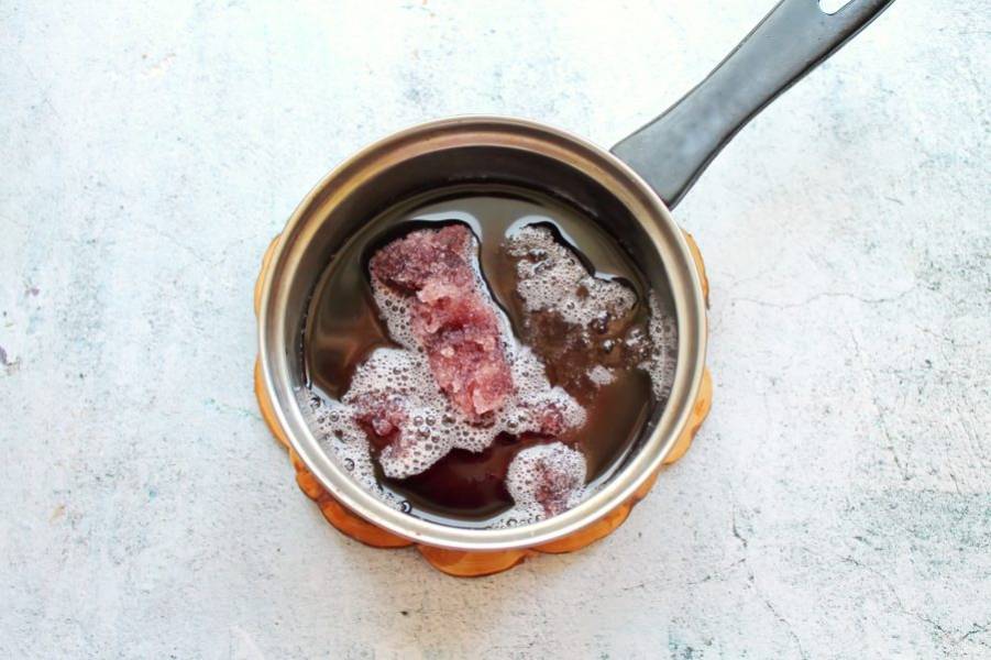 Сок смешайте с сахаром, подогрейте, чтобы сахар весь растворился. Снимите с огня и выложите набухший желатин. Мешайте до полного растворения желатина.