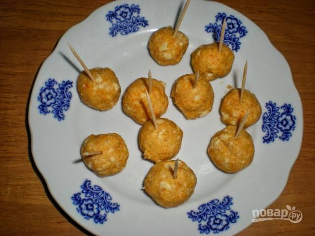 Сформируйте шарики с размером грецкий орех. В каждый шарик воткните зубочистку.