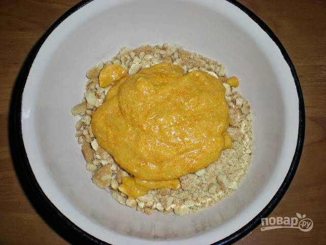 Печенье измельчите, добавьте творожно-тыквенную смесь и размешайте до однородной массы.