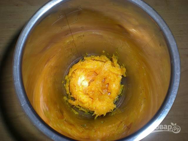 Заблаговременно приготовьте тыкву и сделайте из нее пюре с помощью блендера. Тыкву можно запечь кусочками в духовке или потушить.