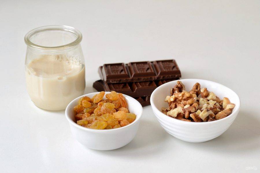Заполните силиконовые формы шоколадом наполовину, добавьте орехи и изюм.