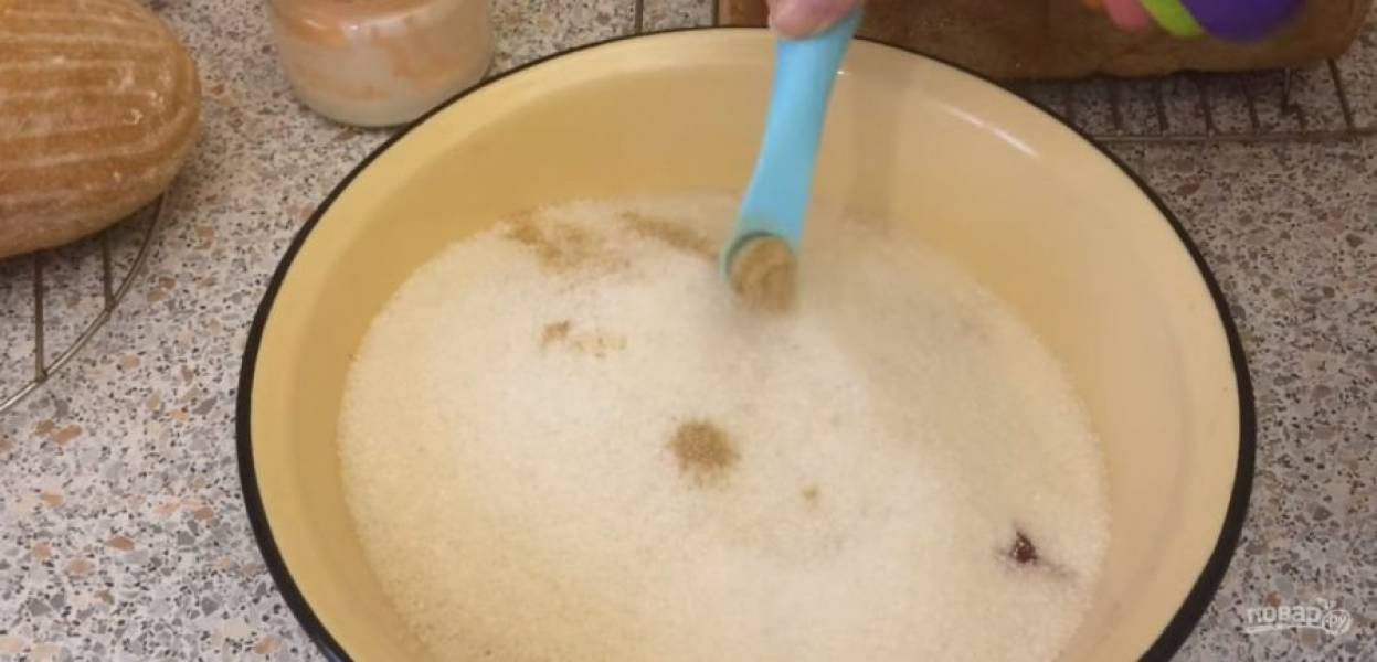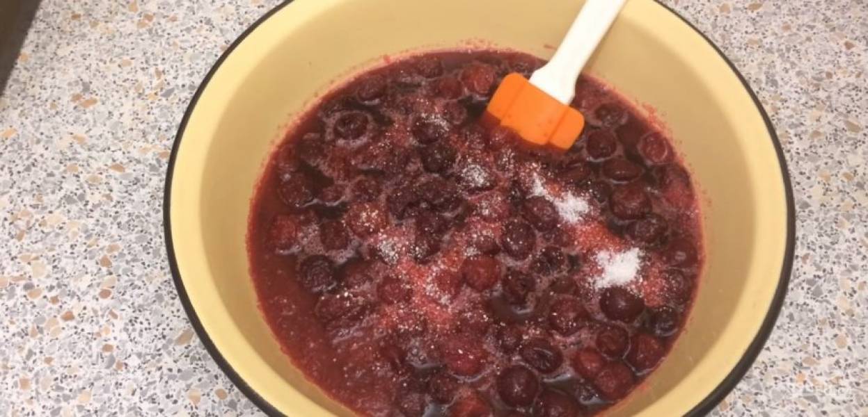 1. Вишню разморозьте и выложите в эмалированную миску. Покройте вишню белым сахаром, добавьте сушеный молотый имбирь и оставьте массу на 5 часов.