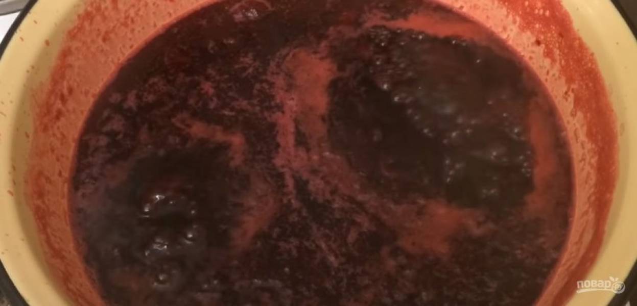 4. Снимите массу с плиты и взбейте массу блендером. Снова отправьте конфитюр на плиту на самый сильный огонь, доведите до кипения и кипятите 4 минуты. Переложите конфитюр с стерилизованные баночки и неплотно прикройте крышкой.