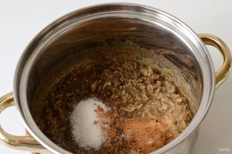 В конце добавьте сахар и специи, перемешайте. Проварите еще 1-2 минуты и снимайте с плиты.
