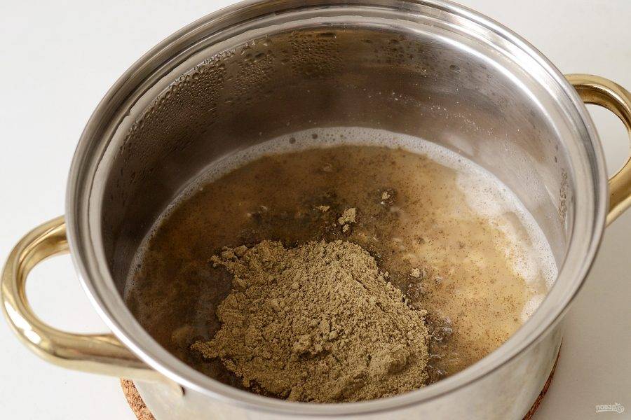 Следом добавьте конопляную муку и варите кашу 6-10 минут.