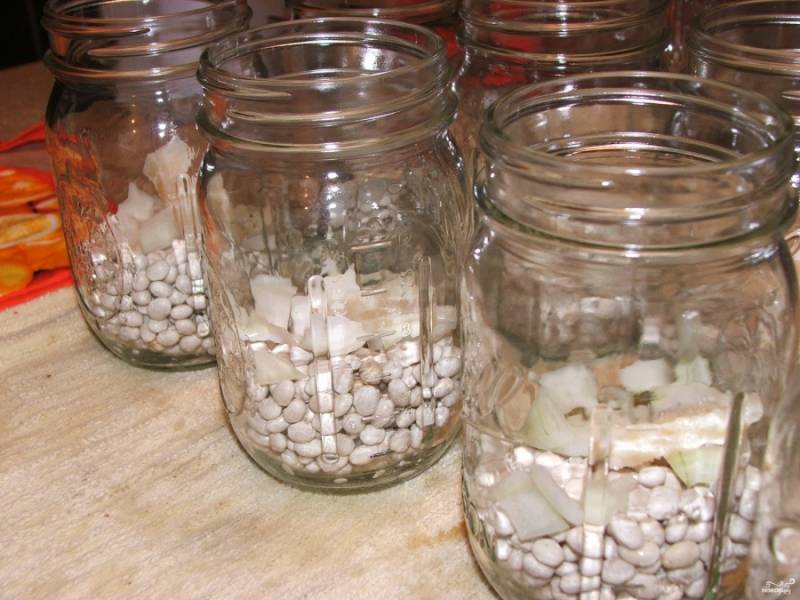 Промойте и переберите сухую фасоль. Залейте её водой на ночь, чтобы разбухла. На следующий день отварите до полуготовности. Распределите по стерилизованным банкам (у меня было 8 пол-литровых банок). Лук почистите, порежьте кубиками и добавьте в каждую банку (по 2-3 ст.л. примерно получается).