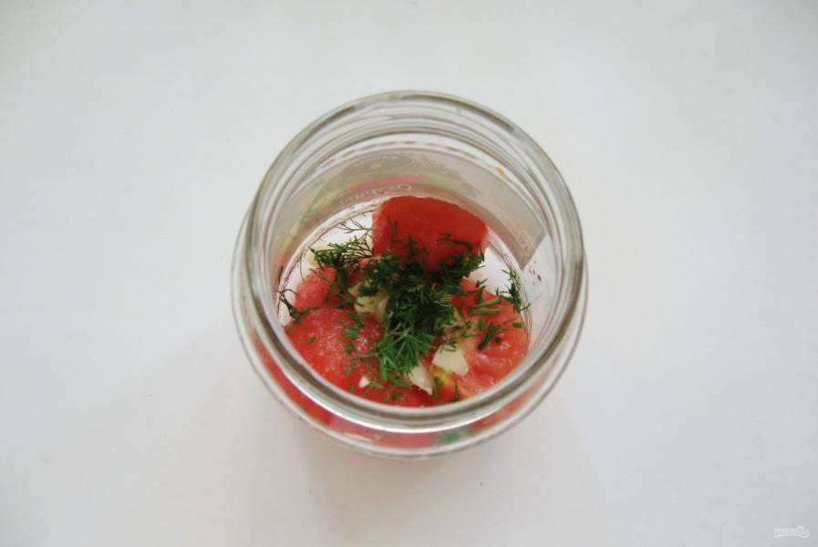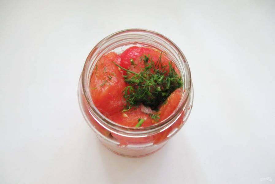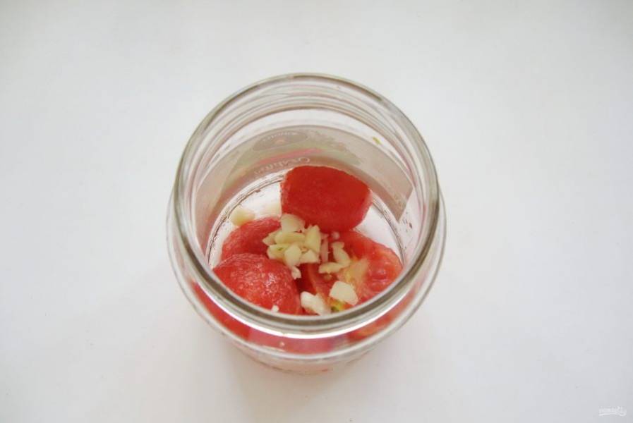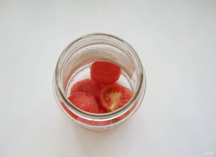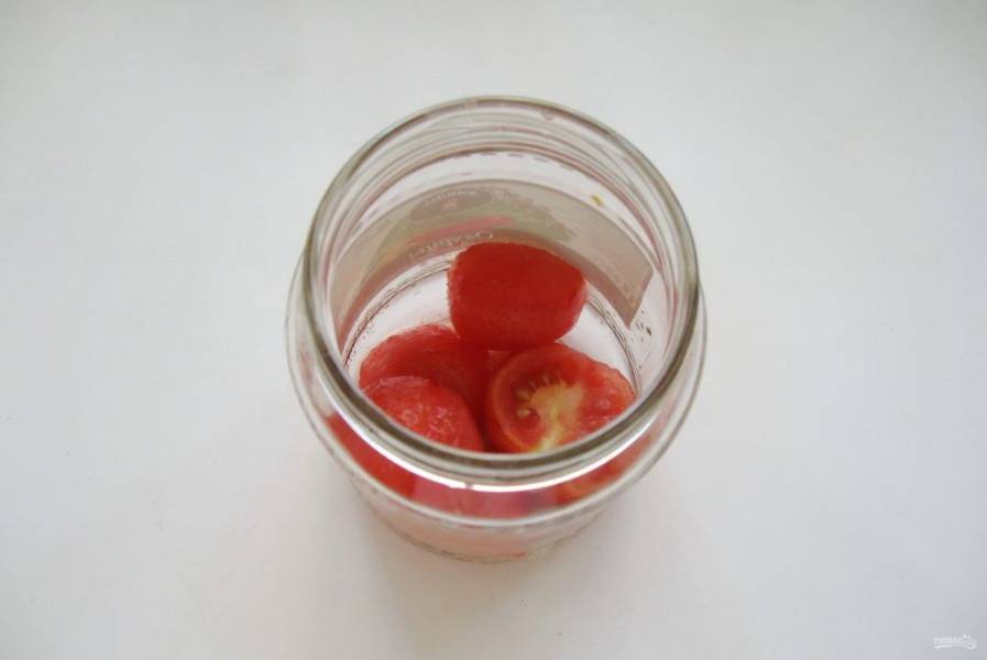 Банки берите по 500 мл, простерилизуйте. На дно банки налейте чайную ложку уксуса. Затем выложите слой помидор.