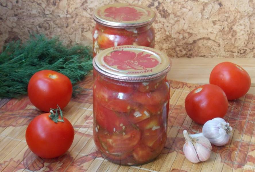Заполненные банки накройте стерилизованными крышками. Затем поставьте в кастрюлю, на дно которой постелите тряпичную салфетку. Налейте воду в кастрюлю, чтобы она доходила до плечиков банки. Стерилизуйте банки с помидорами 15-20 минут с момента закипания воды в кастрюле. Затем закатайте крышками, укутайте теплым одеялом до полного остывания на сутки. Храните консервы в прохладном помещении.