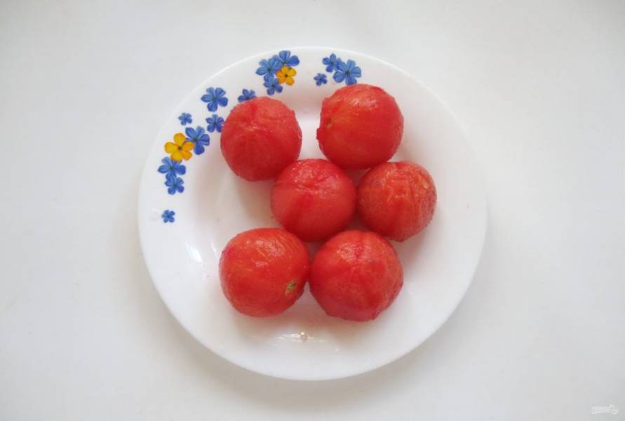 Вскипятите в кастрюле воду и на 2-3 минуты окуните в неё помидоры. Затем обдайте холодной водой и снимите шкурку.