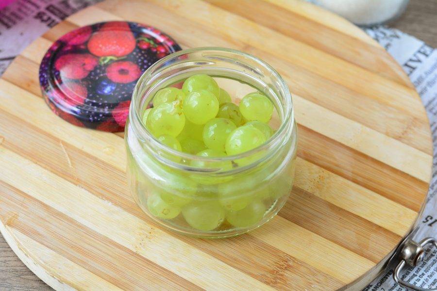 Сложите ягоды винограда в чистую простерилизованную стеклянную банку.