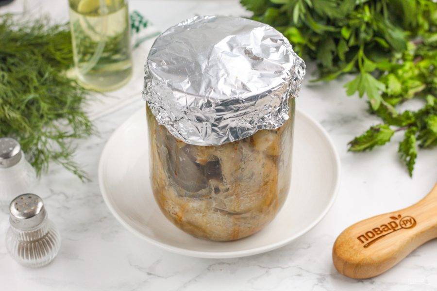 Извлеките банку из духовки, ошпарьте закаточную крышку кипятком и аккуратно удалите фольгу с банки. Накройте ее горячей крышкой и моментально закрутите по резьбе или законсервируйте специальным гаджетом. Оставьте остывать при комнатной температуре.