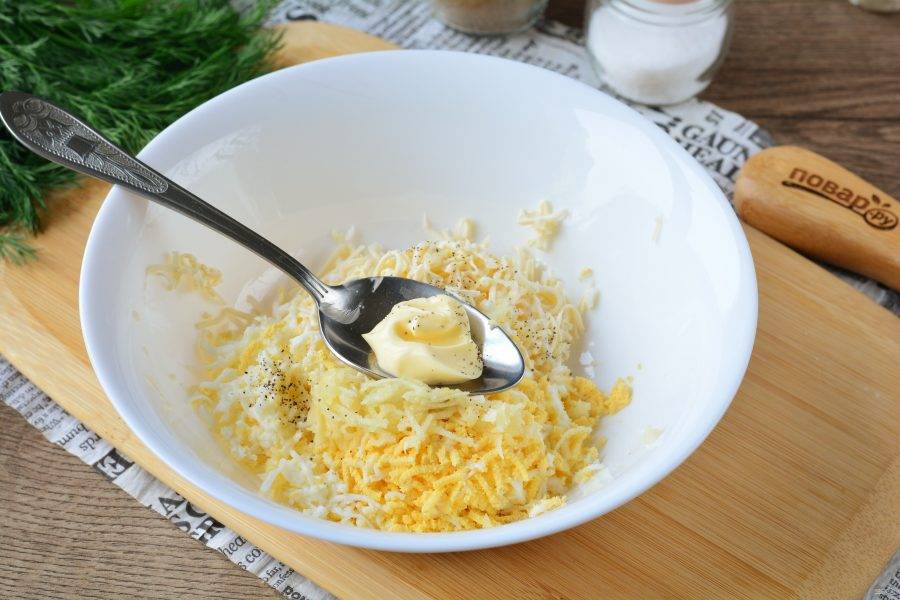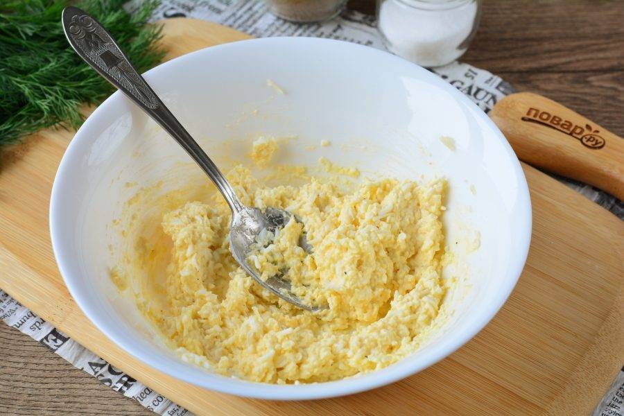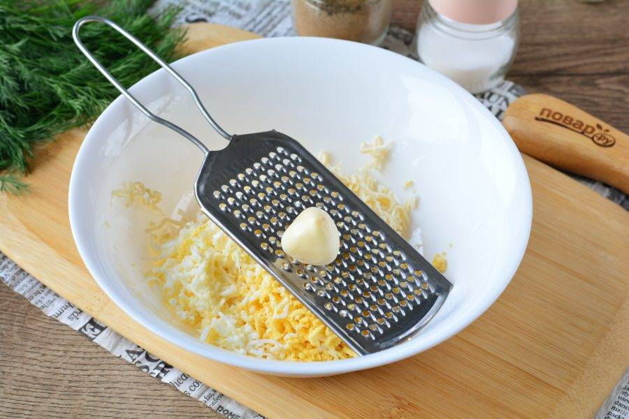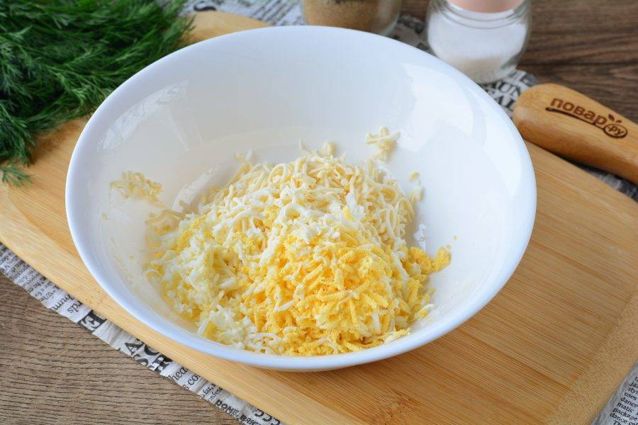 Сварите яйца вкрутую. Натрите на мелкой терке яйца и плавленый сырок.