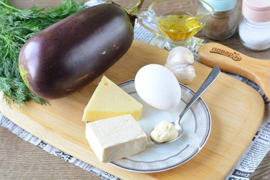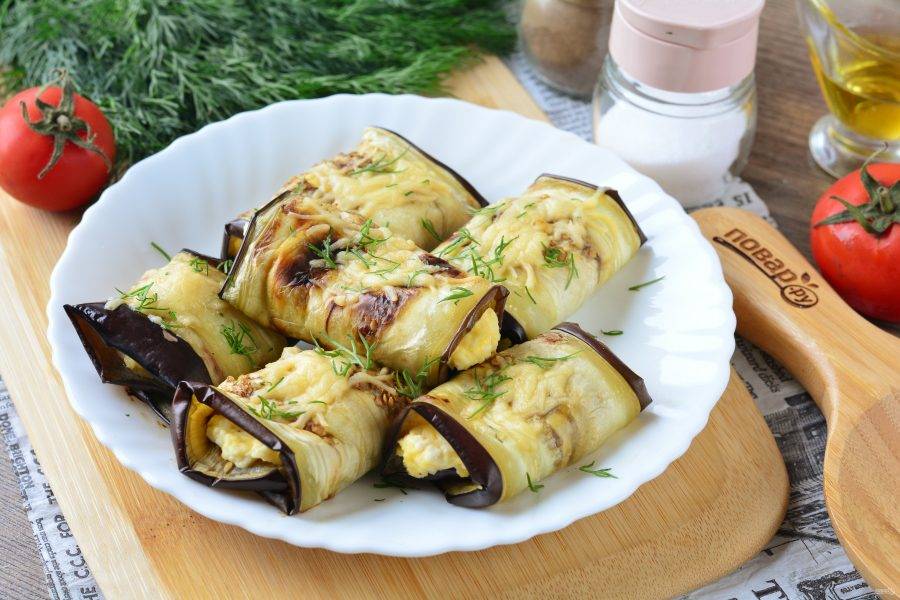 Простая и вкусная закуска — конвертики из баклажанов. Закуска станет украшением вашего стола. Для начинки используйте плавленый сыр, чеснок, яйца и немного майонеза.