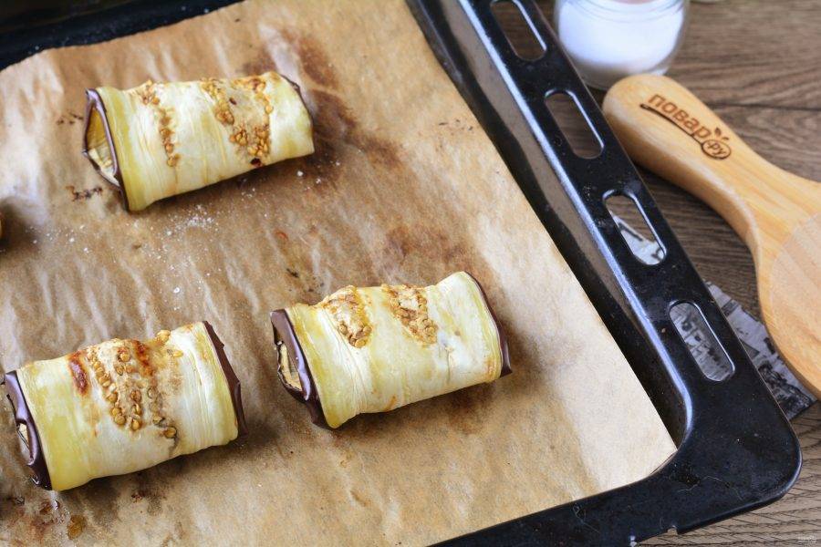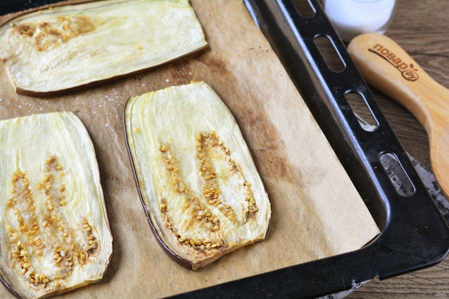 Баклажаны смажьте растительным маслом и выложите на противень, запекайте в духовке 25-30 минут до мягкости при температуре 200 градусов.