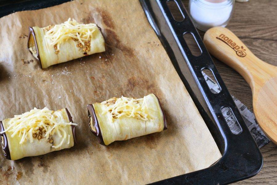 На запеченные баклажаны выложите сырно-яичную начинку.