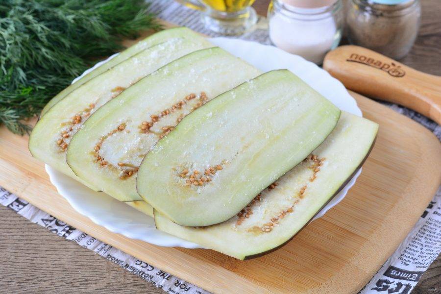 Нарежьте пластинами баклажаны. Присыпьте солью и оставьте на 15 минут, чтобы вышел сок и горечь.