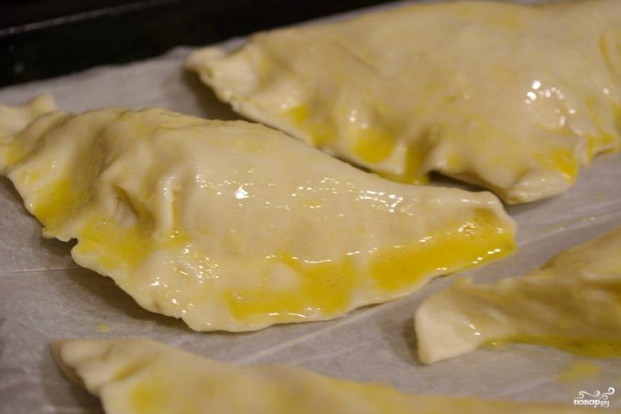 Соедините края квадратика, защипните. Выложите подготовленные конвертики на противень, покрытый пергаментом для выпечки. Конвертики нужно смазать взбитым желтком. Сверху можно посыпать конвертики кунжутом или семенами льна.