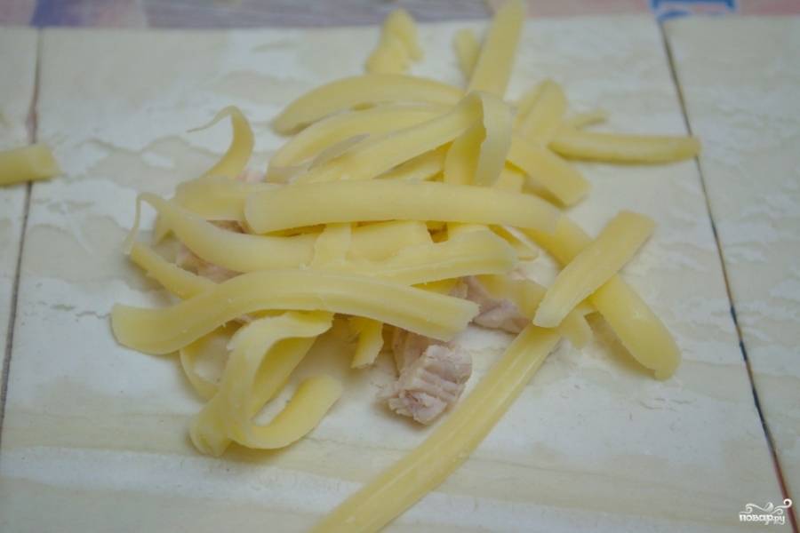 Подготовьте начинку для конвертиков из бездрожжевого слоеного теста. В качестве начинки я беру отварную индейку и твердый сыр. Мясо можно заменить на рыбу, добавьте в начинку зелень.