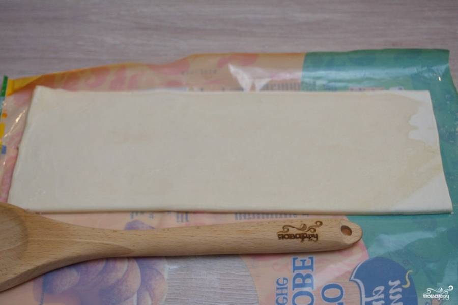 Для приготовления конвертиков из бездрожжевого слоеного теста нужно взять само тесто. Разморозьте тесто (отдельно каждый листик). После разморозки, тесто раскатайте в пласт.