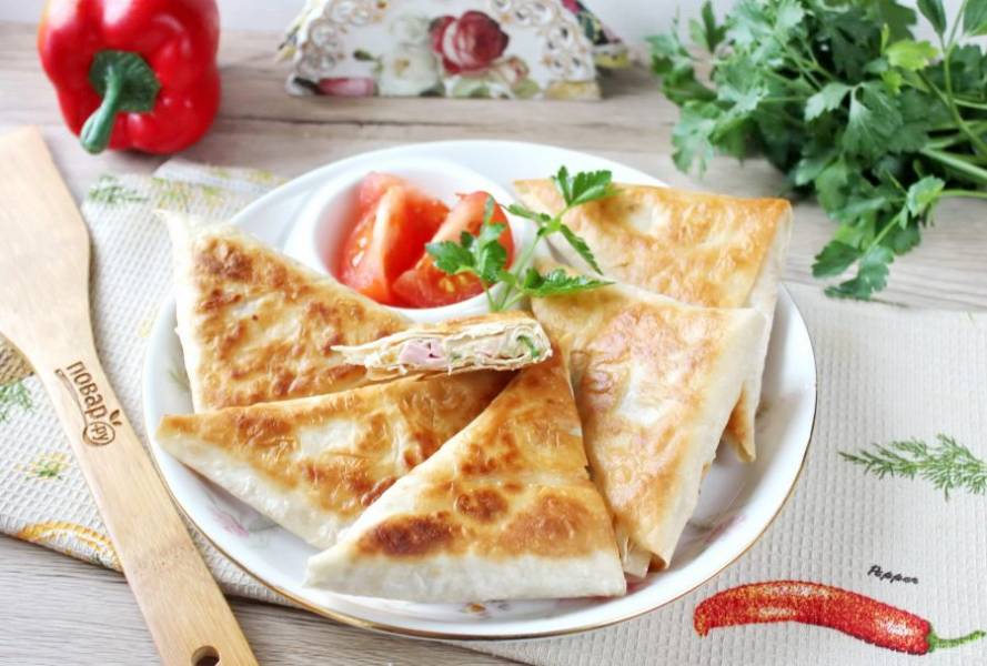 Переложите конвертики из лаваша с колбасой и сыром на тарелку. Подавайте к столу горячими.