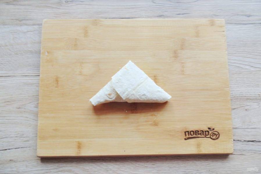 Переверните завёрнутую часть лаваша с начинкой в левую сторону.