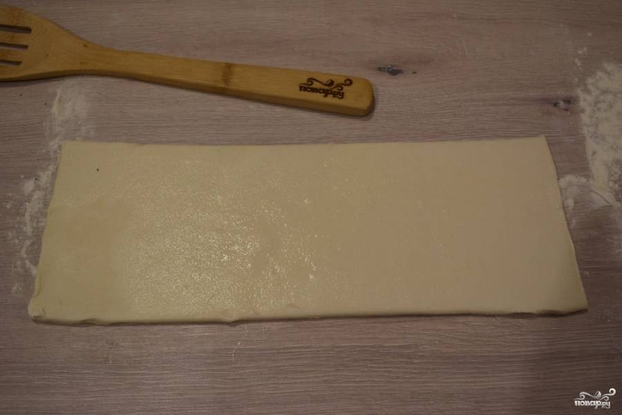 Лист слоеного теста раскатайте на столе, присыпанном мукой.