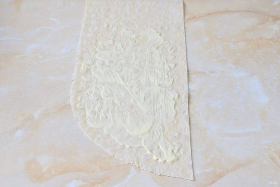 Лаваш можно нарезать на кусочки необходимого размера. Намажьте лаваш майонезом.