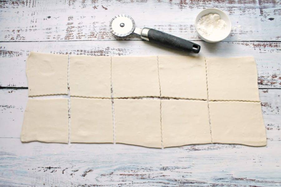 Рабочую поверхность стола посыпьте мукой и немного раскатайте слоеное тесто. Разрежьте его на квадратики, у меня получилось 10 штук.