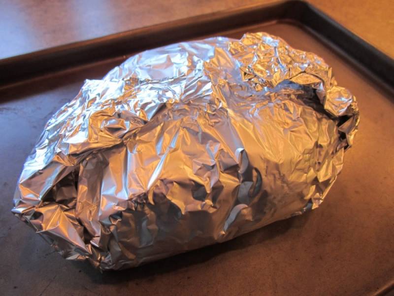 Маринованное мясо оберните фольгой и отправьте в духовку на 20 минут при 200 градусах.