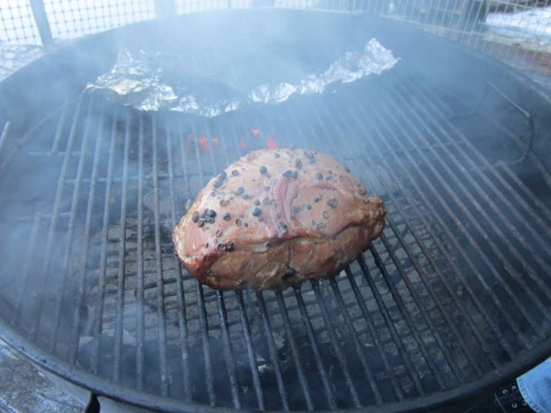 Разожгите гриль и коптите мясо с можжевеловыми ветвями 20 минут.