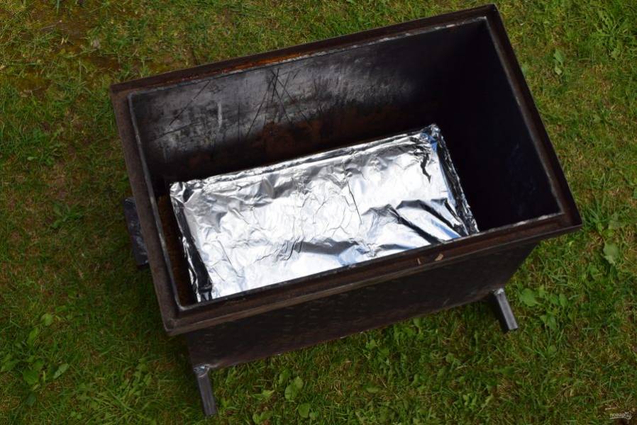 Опустите в коптильню поддон. Можно накрыть его фольгой, чтобы потом было легче его отмыть от жира.