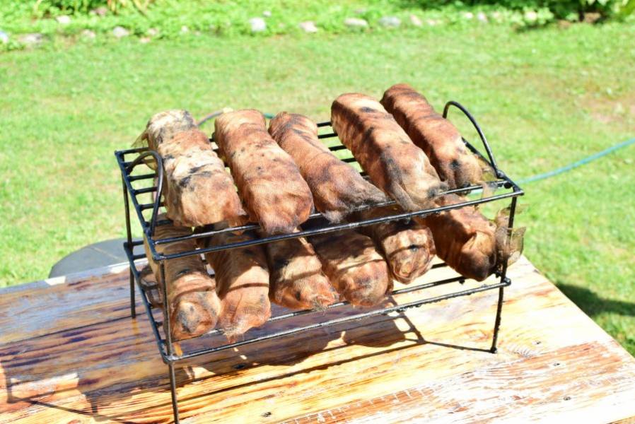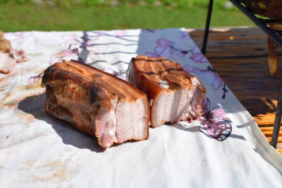 Теперь извлеките решетку с мясом из коптильни. Как видите, лишняя гарь будет на марле, а не на мясе.