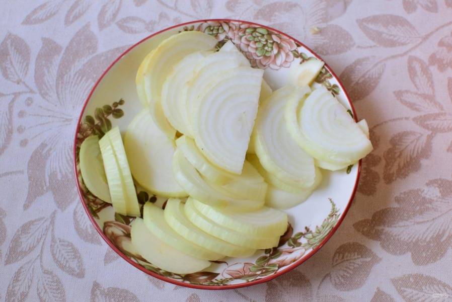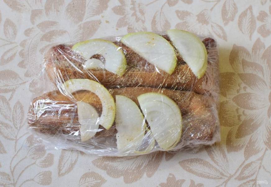 Выложите на грудинку нарезанный лук и оберните в пищевую пленку по 1-2 кусочка. В такой упаковке мясо быстрее пропитается солью и специями. Уберите в холодильник на 2 суток. Этого времени будет достаточно, чтобы мясо просолилось, но не было очень соленым.
